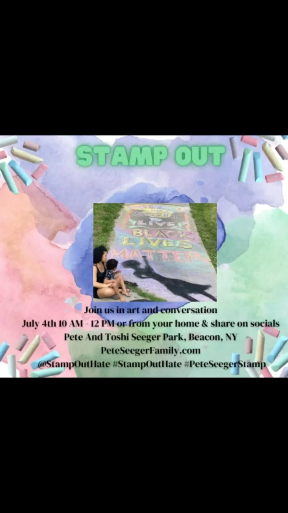 You can also chalk from home and share on social media with #StampOutHate #PeteSeegerStamp - Free Chalk pickup is available all July 4th Weekend at Meyer’s Olde Dutch 184 Main Street, Beacon, NY & Split Rock Books 97 Main Steet, Cold Spring, NY.